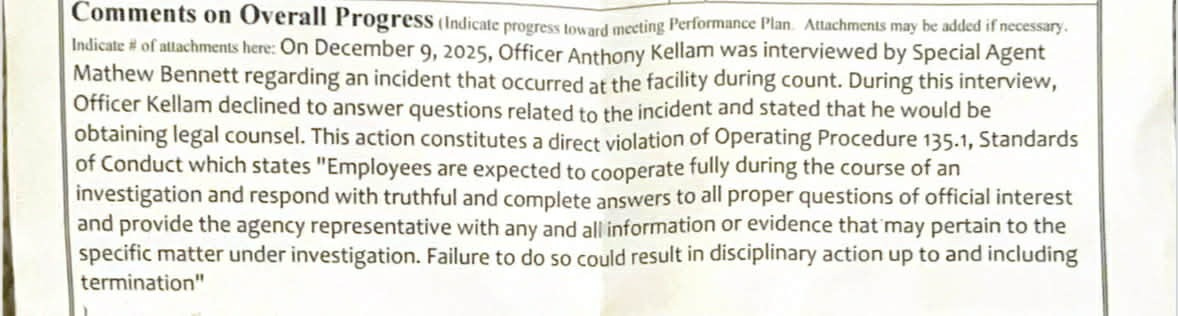 According to a probationary progress document obtained by Virginia Scope, Kellam’s probationary period was extended Dec. 16, with the document citing his decision to seek legal counsel as a “direct violation” of the Department of Corrections’ standards of conduct.